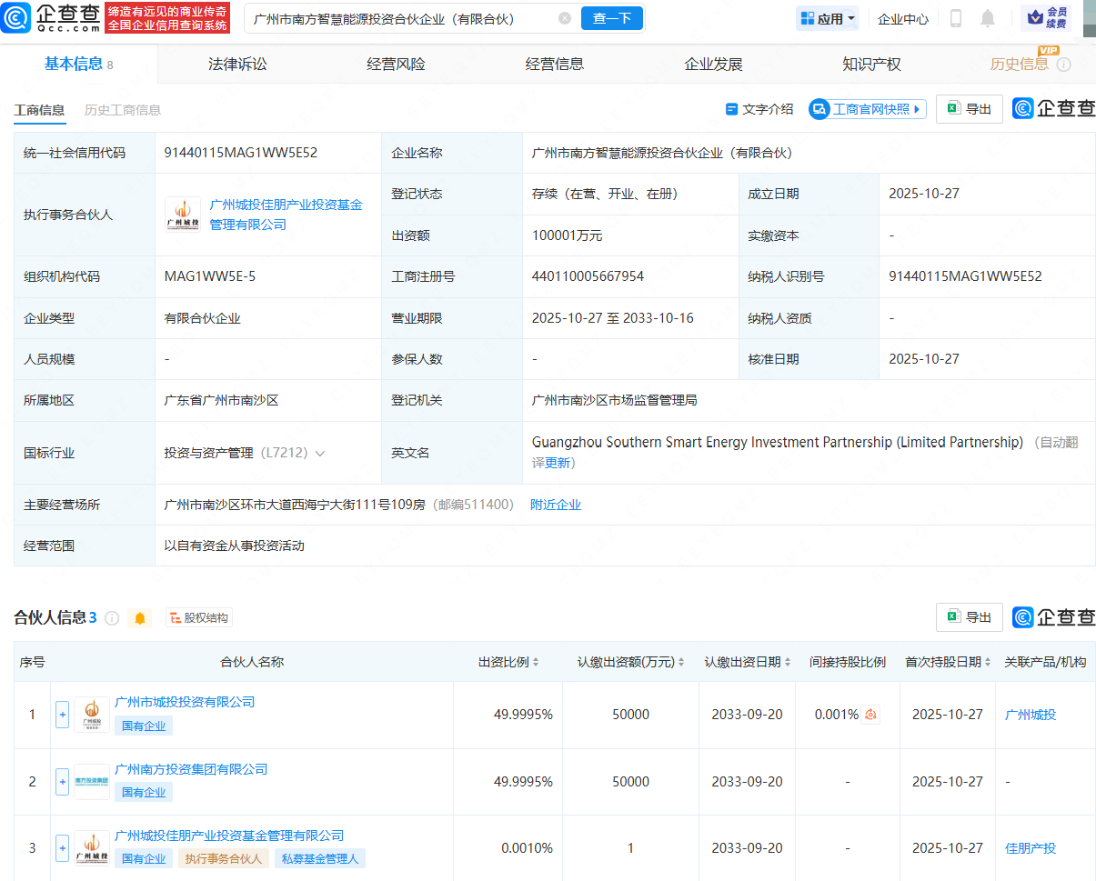 近日,广州市南方智慧能源投资合伙企业(有限合伙)成立,出资额约10亿元股票按天配资申请,经营范围包含:以自有资金从事投资活动。企查查股权穿透显示,该合伙企业由广州市城投投资有限公司、广州南方投资集团有限公司等共同持股。